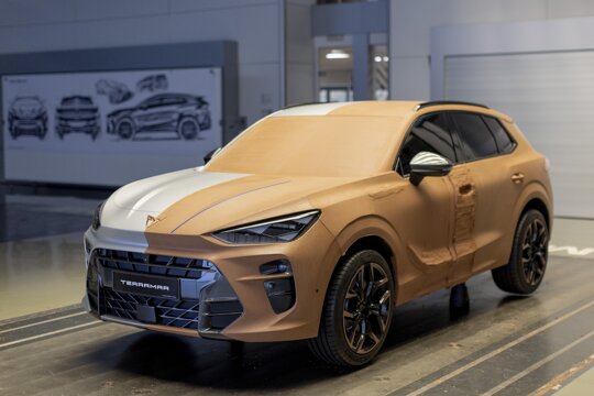 In een van de minder toegankelijke ruimtes van het Technisch Centrum van CUPRA staat de CUPRA Terramar op ware grootte. Dit is een kleimodel, voorafgaand aan de versie die uiteindelijk in de showrooms wereldwijd te zien zal zijn. De ene kant van het model wordt met vinyl omwikkeld om te lijken op een realistisch model dat al van een lakkleur is voorzien. De andere kant van het model is een volledig blootgelegde, aardekleurige mock-up gemaakt met meer dan vijfduizend kilo klei – met de hand gefreesd volgens nauwkeurige parameters en daarna handmatig gepolijst. Bij de CUPRA Terramar was deze fase, het maken van een kleimodel, belangrijk in het ontwerpproces: omdat het een SUV is, wilden de ontwerpers de nadruk leggen op de royale lengte van 4,5 meter door het carrosseriekleur te benadrukken, terwijl ze het atletische en sportieve karakter van het voertuig behouden.
