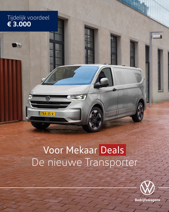 Je rijdt de nieuwe Transporter nu extra voordelig tijdens onze Voor Mekaar Deals, want je profiteert van € 3.000 tijdelijk voordeel op alle uitvoeringen van de nieuwe Transporter. En kies je voor de nieuwe Transporter, dan kun je daarnaast altijd rekenen op onze uitstekende service, zodat jij je volledig kunt richten op wat écht belangrijk is voor jou. Bekijk snel deze Voor Mekaar Deal.